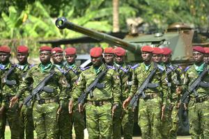 (250221) -- ABIYAN, 21 febrero, 2025 (Xinhua) -- Imagen del 20 de febrero de 2025 de soldados marfileños asistiendo a una ceremonia oficial de entrega en el campamento militar, en Abiyán, Cote d'Ivoire. Francia transfirió oficialmente el jueves el control de su única base militar en Cote d'Ivoire, el campamento del 43º Batallón de Infantería de Marina, a las autoridades de la nación de Africa Occidental. (Xinhua/Yvan Sonh) (oa) (ra) (ce)