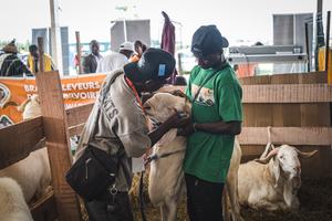 (250527) -- ABIYÁN, 27 mayo, 2025 (Xinhua) -- Imagen del 26 de mayo de 2025 de expositores marcando una oveja durante la 7ª Feria Internacional de Agricultura y Recursos Animales, en Abiyán, Cote d'Ivoire. En un periodo de 10 días, se espera que la feria atraiga a más de 500.000 visitantes y cerca de 1.000 expositores presentando productos y servicios a lo largo de Africa, Asia y Europa. (Xinhua/Wang Guansen) (oa) (ah) (vf)
