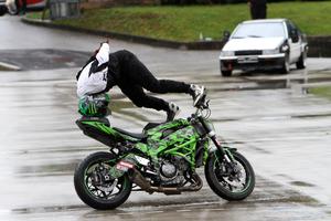 (250426) -- KARLOVAC, 26 abril, 2025 (Xinhua) -- Imagen del 25 de abril de 2025 de un piloto de acrobacias realizando una presentación sobre una motocicleta durante el Festival de Acrobacias, en Karlovac, Croacia. (Xinhua/Kristina Stedul Fabac/PIXSELL) (oa) (da)