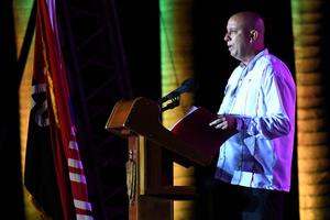 (250726) -- CIEGO DE AVILA, 26 julio, 2025 (Xinhua) -- El primer secretario del Partido Comunista de Cuba en Ciego de Avila, Julio Heriberto Gómez, pronuncia un discurso en el acto central por el aniversario 72 de los sucesos del 26 de julio de 1953, en la ciudad de Ciego de Avila, Cuba, el 26 de julio de 2025. El primer ministro de Cuba, Manuel Marrero, aseguró el sábado que Cuba superará el obstáculo del bloqueo que desde hace más de seis décadas mantiene Estados Unidos contra la nación caribeña. Marrero fue el principal orador del acto realizado en la ciudad de Ciego de Avila, a unos 425 kilómetros al este de La Habana, donde se celebró el acto central por el aniversario 72 de los sucesos del 26 de julio de 1953, con la presencia del presidente Miguel Díaz-Canel y del líder histórico y exmandatario Raúl Castro. (Xinhua/Joaquín Hernández) (jh) (jg) (da)