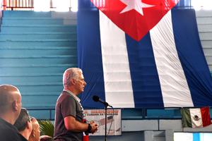(250726) -- CIEGO DE AVILA, 26 julio 2025 (Xinhua) -- Imagen del 25 de julio de 2025 del presidente cubano, Miguel Díaz-Canel, pronunciando un discurso en un acto de solidaridad con Cuba y contra el bloqueo llevado a cabo en una sala polideportiva, en la ciudad de Ciego de Avila, Cuba. Unos 370 activistas de 23 países participaron el viernes en un acto de solidaridad con Cuba y contra el bloqueo que desde hace más de seis décadas mantiene Estados Unidos sobre el país caribeño. (Xinhua/Joaquín Hernández) (jh) (jg) (da)