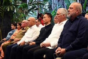 (250930) -- LA HABANA, 30 septiembre, 2025 (Xinhua) -- Imagen del 29 de septiembre de 2025 del presidente cubano, Miguel Díaz-Canel (2-d), el primer ministro cubano, Manuel Marrero (d), y el embajador de China en Cuba, Hua Xin (3-d), participando en el acto por el 65° aniversario del establecimiento de relaciones diplomáticas entre Cuba y China y el 76° aniversario de la fundación de la República Popular China, en el Palacio de la Revolución, sede del Gobierno cubano, en La Habana, capital de Cuba. Las principales autoridades de Cuba, encabezadas por Díaz-Canel, asistieron el lunes en La Habana al acto por el 65° aniversario del establecimiento de relaciones diplomáticas entre Cuba y China y el 76° aniversario de la fundación de la República Popular China. (Xinhua/Joaquín Hernández) (jh) (jg) (ra) (vf)