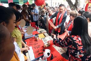 (250125) -- LA HABANA, 25 enero, 2025 (Xinhua) -- El embajador de China en Cuba, Hua Xin (c-atrás), muestra un trabajo de caligrafía en un estand de China durante la inauguración de una Feria Cultural previo a la celebración del Año Nuevo Lunar, en La Habana, capital de Cuba, el 25 de enero de 2025. Los cubanos mostraron el legado histórico chino con la realización por primera vez de una Feria Cultural en vísperas de la llegada del Año Nuevo Lunar. (Xinhua/Joaquín Hernández) (jh) (da)