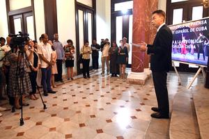 (251023) -- LA HABANA, 23 octubre, 2025 (Xinhua) -- Imagen del 22 de octubre de 2025 del embajador de China en Cuba, Hua Xin (d), hablando durante una conferencia de prensa sobre el anuncio oficial de una gira del Ballet Español de Cuba por China, en la Embajada de China en Cuba, en La Habana, capital de Cuba. El Ballet Español de Cuba, bajo la dirección del maestro Eduardo Veitía, iniciará el 27 de octubre su tercera gira por China, la cual se extenderá hasta diciembre de 2025. (Xinhua/Joaquín Hernández) (jh) (da) (ra) (ce)