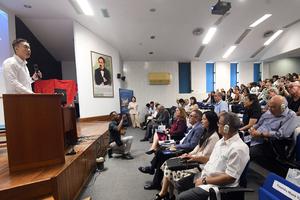 (251111) — LA HABANA, 11 noviembre, 2025 (Xinhua) — Imagen del 10 de noviembre de 2025 del embajador chino en Cuba, Hua Xin (i), pronunciando un discurso durante la celebración de la colaboración científica entre China y Cuba en el Centro de Neurociencias de Cuba, en La Habana, capital de Cuba. Con el estreno en La Habana del documental de realización china «Corazón cubano, sentimiento chino», dedicado al eminente neurocientífico cubano, Pedro Valdés Sosa, investigadores y académicos de ambas naciones celebraron la colaboración científica entre China y Cuba. (Xinhua/Joaquín Hernández) (jh) (jg) (ra) (ce)