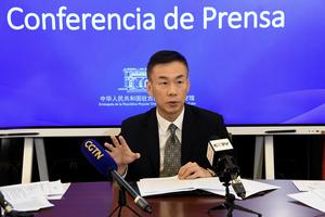 (250314) -- LA HABANA, 14 marzo, 2025 (Xinhua) -- Imagen del 12 de marzo de 2025 del embajador de China en Cuba, Hua Xin, hablando en una conferencia de prensa, en La Habana, capital de Cuba. Los principales medios de comunicación de Cuba destacaron los resultados de las sesiones anuales de la XIV Asamblea Popular Nacional de China y del XIV Comité Nacional de la Conferencia Consultiva Política del Pueblo Chino. El diario Granma, órgano oficial del Partido Comunista de Cuba, informó sobre la conferencia de prensa convocada por el embajador de China en Cuba, Hua Xin, quien ofreció detalles de los resultados de las llamadas dos sesiones, realizadas en Beijing entre el 4 y el 11 de este mes. (Xinhua/Joaquín Hernández) (jh) (jg) (da) (ce)