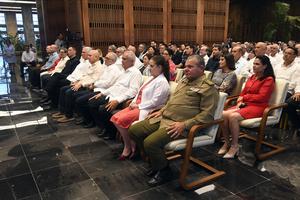 (250815) -- LA HABANA, 15 agosto, 2025 (Xinhua) -- Imagen del 14 de agosto de 2025 del presidente cubano, Miguel Díaz-Canel (6-d-frente), y el embajador chino en Cuba, Hua Xin (7-d-frente), participando en un acto en conmemoración del 80° aniversario de la victoria de China contra la agresión japonesa, en el Palacio de la Revolución, sede del gobierno cubano, en La Habana, capital de Cuba. Las principales autoridades de Cuba, encabezadas por el presidente del país, Miguel Díaz-Canel, asistieron el jueves a la conmemoración del 80° aniversario de la victoria en la Guerra de Resistencia del Pueblo Chino contra la Agresión Japonesa (1931-1945) y la Guerra Antifascista Mundial. (Xinhua/Joaquín Hernández) (jh) (jg) (rtg) (vf)