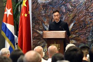 (250815) -- LA HABANA, 15 agosto, 2025 (Xinhua) -- Imagen del 14 de agosto de 2025 del embajador chino en Cuba, Hua Xin, pronunciando un discurso en un acto en conmemoración del 80° aniversario de la victoria de China contra la agresión japonesa, en el Palacio de la Revolución, sede del gobierno cubano, en La Habana, capital de Cuba. Las principales autoridades de Cuba, encabezadas por el presidente del país, Miguel Díaz-Canel, asistieron el jueves a la conmemoración del 80° aniversario de la victoria en la Guerra de Resistencia del Pueblo Chino contra la Agresión Japonesa (1931-1945) y la Guerra Antifascista Mundial. (Xinhua/Joaquín Hernández) (jh) (jg) (rtg) (vf)