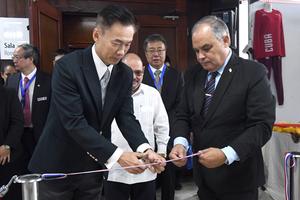 (251112) -- LA HABANA, 12 noviembre, 2025 (Xinhua) -- Imagen del 11 de noviembre de 2025 del presidente del Instituto Cubano de Deporte, Educación Física y Recreación, Osvaldo Vento (d-frente), y el embajador de China en Cuba, Hua Xin (i-frente), cortando la cinta de inauguración de la XI Convención Internacional de Actividad Física y Deportes (Afide 2025), en La Habana, capital de Cuba. Bajo el lema "Ciencia para vencer", la Afide 2025 inauguró oficialmente el martes sus sesiones en el capitalino Palacio de las Convenciones de La Habana. (Xinhua/Joaquín Hernández) (jh) (jg) (da) (ce)