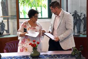 (251127) -- LA HABANA, 27 noviembre, 2025 (Xinhua) -- Imagen del 26 de noviembre de 2025 de Teresa Li (i), directora del Barrio Chino de La Habana, y Anier Pérez (d), decano de la Facultad de Lenguas Extranjeras de la Universidad de La Habana, conversando después de firmar un convenio de colaboración durante un festival de poesía china, en La Habana, capital de Cuba. El Barrio Chino de La Habana y la Facultad de Lenguas Extranjeras de la Universidad de La Habana firmaron el miércoles un convenio de colaboración académica y cultural con el propósito de promover el estudio de la lengua y la cultura del país asiático en Cuba. (Xinhua/Joaquín Hernández) (jh) (rtg) (ra) (ce)