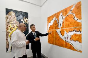 (250221) -- LA HABANA, 21 febrero de 2025 (Xinhua) -- Imagen del 20 de febrero de 2025 del embajador de China en Cuba, Hua Xin (d), y un visitante observando una pintura exhibida en la exposición "Puentes culturales: Diálogo Oriente-Occidente" como parte de la XV Bienal de Arte de La Habana, en la Biblioteca Nacional José Martí, en La Habana, capital de Cuba. Un grupo de pintores chinos contemporáneos sumaron sus obras a la XV Bienal de Arte de La Habana con la inauguración de la exposición "Puentes culturales: Diálogo Oriente-Occidente". (Xinhua/Joaquín Hernández) (jh) (rtg) (ra) (ce)