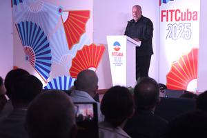 (250501) -- LA HABANA, 1 mayo, 2025 (Xinhua) -- Imagen del 30 de abril de 2025 del primer ministro cubano, Manuel Marrero, pronunciando un discurso en la apertura de la Feria Internacional del Turismo FITCuba 2025 con China como País invitado de honor, en el Parque Histórico Militar Morro-Cabaña, en La Habana, capital de Cuba. Las culturas china y cubana se fusionaron en una singular Gala artística para cerrar el Día de China en la FITCuba 2025, que sesiona desde el miércoles y hasta el próximo sábado. (Xinhua/Joaquín Hernández) (jh) (jg) (ah) (vf)
