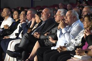 (250501) -- LA HABANA, 1 mayo, 2025, 2025 (Xinhua) -- Imagen del 30 de abril de 2025 del presidente cubano, Miguel Díaz-Canel (3-d-frente); el primer ministro cubano, Manuel Marrero (4-d-frente); el viceministro de Cultura y Turismo de China, Rao Quan (3-i); participando en una Gala artística para cerrar el Día de China en la Feria Internacional del Turismo FITCuba 2025, en el Teatro Karl Marx, en La Habana, capital de Cuba. Las culturas china y cubana se fusionaron en una singular Gala artística para cerrar el Día de China en la Feria Internacional del Turismo FITCuba 2025, que sesiona desde el miércoles y hasta el próximo sábado. (Xinhua/Joaquín Hernández) (jh) (rtg) (ra) (vf)