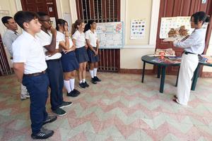 (250529) — LA HABANA, 29 mayo, 2025 (Xinhua) — La profesora china, Hou Jiaqi (d), de 28 años, muestra un cuaderno de dibujos a alumnos de la escuela secundaria Fructuoso Rodríguez en el barrio del Vedado, en La Habana, capital de Cuba, el 29 de mayo de 2025. Tres años después de comenzar, un novedoso proyecto arroja sus primeros frutos en el aprendizaje del idioma chino como segunda lengua optativa en la enseñanza secundaria cubana en cumplimiento de un acuerdo entre los ministerios de Educación de China y Cuba. (Xinhua/Joaquín Hernández) (jh) (da) (ra) (vf)