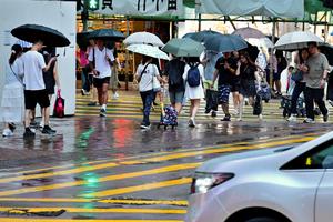 (250802) -- HONG KONG, 2 agosto, 2025 (Xinhua) -- Peatones usan paraguas para protegerse de la lluvia mientras caminan, en Hong Kong, en el sur de China, el 2 de agosto de 2025. El Observatorio de Hong Kong emitió el sábado la señal de alerta de tormenta negra, la segunda vez esta semana. (Xinhua/Zhu Wei) (jg) (da)