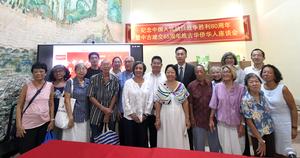 (250929) -- LA HABANA, 29 septiembre, 2025 (Xinhua) -- El embajador de China en Cuba, Hua Xin (c-d-atrás), posa para una fotografía grupal junto a participantes de un seminario, en La Habana, capital de Cuba, el 29 de septiembre de 2025. Chinos residentes en La Habana participaron el lunes en un seminario para celebrar el 65º aniversario del establecimiento de relaciones diplomáticas entre China y Cuba y el 80º de la victoria en la Guerra de Resistencia del Pueblo Chino contra la Agresión Japonesa. (Xinhua/Joaquín Hernández) (jh) (rtg) (ah) (ce)