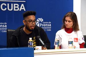 (260320) -- LA HABANA, 20 marzo, 2026 (Xinhua) -- Imagen del 19 de marzo de 2026 del activista y director ejecutivo de The People's Forum, Manolo de los Santos (i), hablando durante una conferencia de prensa, en La Habana, capital de Cuba. El Convoy Nuestra América llegó el jueves a Cuba en solidaridad con su pueblo y denunció el bloqueo y las presiones del Gobierno de Estados Unidos contra la isla caribeña. (Xinhua/Joaquín Hernández) (jh) (rtg) (ra) (vf)