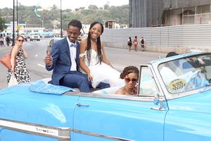 (250214) -- LA HABANA, 14 febrero, 2025 (Xinhua) -- Una pareja de novios viajan en un automóvil antiguo en el marco del Día de los Enamorados, en La Habana, capital de Cuba, el 14 de febrero de 2025. (Xinhua/Joaquín Hernández) (jh) (rtg) (ra) (vf)