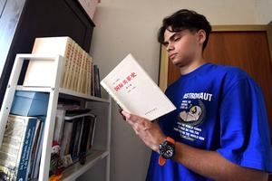 (250601) — LA HABANA, 1 junio, 2025 (Xinhua) — Imagen del 31 de mayo de 2025 del joven Marcel Curbelo, ganador de la edición cubana del concurso Puente Chino para estudiantes de la enseñanza media, leyendo un libro frente a un librero en su casa, en La Habana, capital de Cuba. Curbelo, reciente ganador de la edición cubana del Concurso Puente Chino para estudiantes de la enseñanza media, considera que la cultura china ha marcado su vida de manera profunda. (Xinhua/Joaquín Hernández (jh) (rtg) (oa) (da)