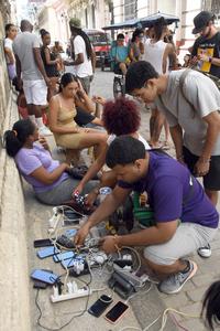 (250316) -- LA HABANA, 16 marzo, 2025 (Xinhua) -- Imagen del 15 de marzo de 2025 de personas sentadas en la acera de una calle mientras esperan que se carguen las baterías de sus dispositivos móviles, servicio brindado por una entidad estatal después de un fallo en el suministro eléctrico, en La Habana, capital de Cuba. La red eléctrica de Cuba ha quedado restablecida el domingo, tras la avería que el pasado viernes provocó un colapso general y que dejó sin energía a la isla caribeña, informó el Ministerio de Energía y Minas (Minem). (Xinhua/Joaquín Hernández) (jh) (rtg) (ah)