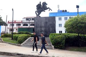 (251204) -- LA HABANA, 4 diciembre, 2025 (Xinhua) -- Imagen del 3 de diciembre de 2025 de personas caminando frente de la escultura de Simón Bolívar, en el barrio de El Vedado, en La Habana, capital de Cuba. (Xinhua/Joaquín Hernández) (jh) (jg) (ah) (vf)