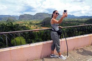(250506) — PINAR DEL RIO, 6 mayo, 2025 (Xinhua) — Imagen del 5 de mayo de 2025 de una turista tomándose una fotografía frente a los mogotes del valle de Viñales, en la provincia de Pinar del Río, Cuba. La exuberante naturaleza del extremo occidental de Cuba y de manera particular de la localidad de Viñales, constituye un atractivo que el Ministerio de Turismo de la isla trata de desarrollar con la vista puesta en el mercado chino. (Xinhua/Joaquín Hernández) (jh) (jg) (ra) (vf)