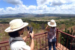 (250510) -- SANCTI SPIRITUS, 10 mayo, 2025 (Xinhua) -- Imagen del 6 de mayo de 2025 de turistas tomando fotografías del paisaje en el Valle de los Ingenios, en la provincia de Sancti Spíritus, Cuba. El Gobierno cubano busca reflotar a la industria turística, otrora "locomotora" de la economía nacional ahora en descenso y golpeada por la crisis internacional y el recrudecimiento del bloqueo que Estados Unidos aplica a Cuba desde hace más de 60 años. (Xinhua/Joaquín Hernández) (jh) (oa) (da)