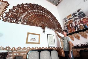 (250512) -- TRINIDAD, 12 mayo, 2025 (Xinhua) -- Imagen del 6 de mayo de 2025 del ebanista, José Miguel Rodríguez Cadalso, mostrando un abanico gigante en su casa, en la ciudad de Trinidad, provincia Sancti Spíritus, Cuba. Unos singulares abanicos, elaborados por el ebanista José Miguel Rodríguez Cadalso, engrosan el patrimonio de la centenaria ciudad de Trinidad, punto de atracción turística en el centro-sur de Cuba con una conservada arquitectura que hace que la urbe parezca atrapada en el tiempo. (Xinhua/Joaquín Hernández) (jh) (oa) (ah) (ce)