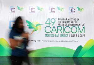 (250708) -- MONTEGO BAY, July 8, 2025 (Xinhua) -- A woman walks past a billboard of the 49th Regular Meeting of the Conference of Heads of Government of the Caribbean Community (CARICOM) in Montego Bay, Jamaica, July 6, 2025. (Xinhua/Li Mengxin)