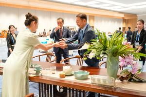 (250831) — TIANJIN, 31 agosto, 2025 (Xinhua) — Invitados experimentan la cultura del té chino previo a un banquete de bienvenida en el Centro de Convenciones y Exposiciones de Meijiang, en Tianjin, en el norte de China, el 31 de agosto de 2025. El presidente chino, Xi Jinping y su esposa, Peng Liyuan, ofrecieron el domingo un banquete en la ciudad portuaria china de Tianjin para dar la bienvenida a los invitados internacionales que se encuentran en el país para asistir a la Cumbre 2025 de la Organización de Cooperación de Shanghai (OCS). Antes del banquete, los invitados observaron y experimentaron el patrimonio cultural inmaterial de China y mantuvieron intercambios amistosos en una atmósfera armoniosa. (Xinhua/Bi Xiaoyang) (rtg) (da)
