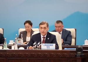 (250901) -- TIANJIN, 1 septiembre, 2025 (Xinhua) -- El secretario general de la Organización de Cooperación de Shanghai (OCS), Nurlan Yermekbayev, habla durante la 25ª Reunión del Consejo de Jefes de Estado de la OCS, en el Centro de Convenciones y Exposiciones de Meijiang, en Tianjin, en el norte de China, el 1 de septiembre de 2025. (Xinhua/Ding Haitao) (rtg) (ah) (ce)