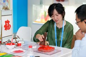(250831) -- TIANJIN, 31 agosto, 2025 (Xinhua) -- Una empleada presenta xilografías de Año Nuevo de Yangliuqing a un periodista en el centro de prensa de la Cumbre 2025 de la Organización de Cooperación de Shanghai (OCS), en Tianjin, en el norte de China, el 31 de agosto de 2025. La Cumbre 2025 de la OCS se lleva a cabo del 31 de agosto al 1 de septiembre en Tianjin. El centro de prensa cuenta con una zona de experiencias de patrimonio cultural inmaterial, que ofrece a los periodistas la oportunidad de experimentar con artesanías locales. (Xinhua/Zhang Xiaoyu) (rtg) (da)