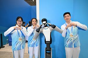 (250831) -- TIANJIN, 31 agosto, 2025 (Xinhua) -- Imagen del 30 de agosto de 2025 de voluntarios gesticulando para fotografías con un robot en el centro de medios para la Cumbre 2025 de la Organización de Cooperación de Shanghai (OCS), en Tianjin, en el norte de China. La Cumbre 2025 de la OCS se lleva a cabo del 31 de agosto al 1 de septiembre en Tianjin. Un equipo de casi 1.000 voluntarios de universidades locales brindan varios servicios en áreas como etiqueta diplomática, respuesta a emergencias y servicios de lenguaje para apoyar la Cumbre de la OCS. (Xinhua/Sun Fanyue) (rtg) (da)
