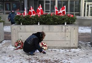(260201) -- COPENHAGUE, 1 febrero, 2026 (Xinhua) -- Imagen del 31 de enero de 2026 de una manifestante colocando flores en la puerta de la embajada de Estados Unidos, en Copenhague, Dinamarca. Miles de ciudadanos y veteranos daneses realizaron una "marcha silenciosa" en Copenhague el sábado por la tarde para protestar contra los recientes y controvertidos comentarios del presidente estadounidense, Donald Trump, quien restó importancia a las contribuciones de los soldados de la OTAN, informaron los medios de comunicación locales. (Xinhua/Anders Kongshaug) (rtg) (ah)