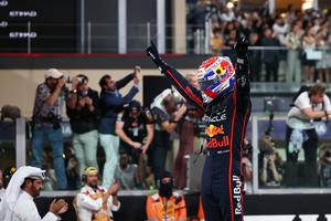 (251208) -- ABU DABI, 8 diciembre, 2025 (Xinhua) -- Imagen del 7 de diciembre de 2025 del piloto neerlandés de la escudería Red Bull, Max Verstappen, festejando al término del Gran Premio de Abu Dabi de Fórmula Uno, en el circuito Yas Marina, en Abu Dabi, Emiratos Arabes Unidos. (Xinhua/Li Chao) (rtg) (ah) (vf)