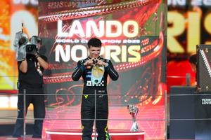 (251208) -- ABU DABI, 8 diciembre, 2025 (Xinhua) -- Imagen del 7 de diciembre de 2025 del piloto británico de la escudería McLaren, Lando Norris, festejando al término del Gran Premio de Abu Dabi de Fórmula Uno, en el circuito Yas Marina, en Abu Dabi, Emiratos Arabes Unidos. (Xinhua/Zhu Xingjian) (rtg) (ah) (vf)