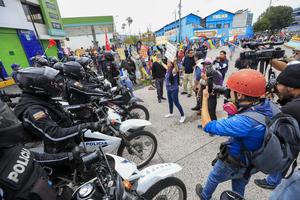 (251012) -- QUITO, 12 octubre, 2025 (Xinhua) -- Manifestantes se enfrentan con policías durante una marcha en el marco del paro nacional, en el sector la Villaflora, en el sur de Quito, capital de Ecuador, el 12 de octubre de 2025. La ciudad ecuatoriana de Quito y sus principales accesos amanecieron el domingo con el blindaje de cientos de militares y policías, así como de tanquetas, ante las marchas convocadas por indígenas y sectores sociales, en apoyo al paro nacional encabezado por la Confederación de Nacionalidades Indígenas de Ecuador contra el alza del diésel. (Xinhua/Ricardo Landeta) (rl) (rtg) (da)