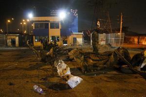 (250927) -- GUAYAQUIL, 27 septiembre, 2025 (Xinhua) -- Imagen del 26 de septiembre de 2025 de policías revisando en el sitio donde explotó un coche bomba frente a la Cárcel Regional de Guayaquil, en la ciudad de Guayaquil, Ecuador. La explosión de un coche bomba ocurrido la noche del viernes frente a la puerta principal de la Cárcel Regional de Guayaquil, la segunda más grande de Ecuador, causó daños en la fachada del penal, informó el sábado la prensa local que citó fuentes militares. (Xinhua/Str) (rl) (oa) (ra) (vf)