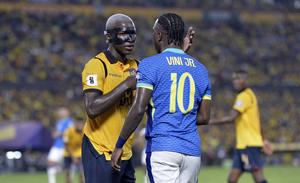 (250606) -- GUAYAQUIL, 6 junio, 2025 (Xinhua) -- Imagen del 5 de junio de 2025 de Moisés Caicedo (i), de Ecuador, reaccionando junto a Vinicius Júnior (d), de Brasil, durante el partido correspondiente a las Eliminatorias Sudamericanas para el Mundial de Estados Unidos, México y Canadá 2026 celebrado en el Estadio Monumental Banco Pichincha, en Guayaquil, Ecuador. (Xinhua/Str) (sa) (rtg) (ra) (vf)