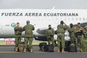 (260116) -- GUAYAQUIL, 16 enero, 2026 (Xinhua) -- Elementos de las Fuerzas Armadas de Ecuador preparan su equipo tras su llegada en aeronaves de la Fuerza Aérea Ecuatoriana como parte del despliegue masivo de militares en una nueva ofensiva contra la delincuencia organizada, en la ciudad de Guayaquil, Ecuador, el 16 de enero de 2026. El Gobierno de Ecuador anunció el jueves el despliegue masivo de cerca de 10.000 militares en las provincias costeras del Guayas, Los Ríos y Manabí, como parte de una nueva fase ofensiva contra la delincuencia organizada, informó el Ministerio de Defensa Nacional. (Xinhua/Ricardo Landeta) (rl) (jg) (da) (vf)