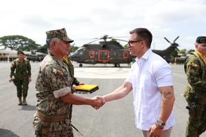 (250602) -- GUAYAQUIL, 2 junio, 2025 (Xinhua) -- Imagen cedida por la Presidencia de Ecuador del presidente ecuatoriano, Daniel Noboa (d), estrechando la mano del general ecuatoriano, Jaime Patricio Vela Erazo (i), jefe del comando conjunto de las Fuerzas Armadas del Ecuador, durante la entrega de dos helicópteros multipropósito Airbus H225, en Guayaquil, Ecuador, el 2 de junio de 2025. Noboa entregó el lunes al Ejército dos helicópteros multipropósito Airbus H225 fabricados en Francia, para fortalecer su capacidad operativa en tareas de seguridad, rescate y atención humanitaria, informó el Gobierno. (Xinhua/Isaac Castillo/Presidencia de Ecuador) (rtg) (oa) (ce)
