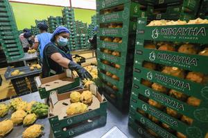 (250819) -- MORONA SANTIAGO, 19 agosto, 2025 (Xinhua) -- Imagen del 18 de agosto de 2025 de una mujer empacando pitahayas, en la exportadora Palora-Exporter, en el cantón Palora, en la provincia de Morona Santiago, Ecuador. De acuerdo con información del Ministerio de Agricultura y Ganadería de Ecuador, en el país existen 8.146 hectáreas sembradas con pitahaya, de las que 6.313 hectáreas corresponden a pitahaya amarilla y 1.815 hectáreas a pitahaya roja. La fruta se cultiva en 17 provincias del país sudamericano. (Xinhua/Ricardo Landeta) (rl) (jg) (ra) (ce)