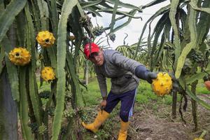 (250819) -- MORONA SANTIAGO, 19 agosto, 2025 (Xinhua) -- Imagen del 18 de agosto de 2025 de un hombre cosechando pitahayas para la exportadora Palora-Exporter, en el cantón Palora, en la provincia de Morona Santiago, Ecuador. De acuerdo con información del Ministerio de Agricultura y Ganadería de Ecuador, en el país existen 8.146 hectáreas sembradas con pitahaya, de las que 6.313 hectáreas corresponden a pitahaya amarilla y 1.815 hectáreas a pitahaya roja. La fruta se cultiva en 17 provincias del país sudamericano. (Xinhua/Ricardo Landeta) (rl) (jg) (ra) (ce)