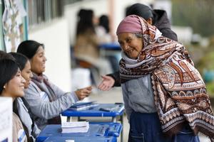 (250413) -- OTAVALO, 13 abril, 2025 (Xinhua) -- Una mujer indígena emite su voto en un colegio electoral en la Unidad Educativa Intercultural Comunitaria Bilingüe Miguel Egas Cabezas, en la ciudad de Otavalo, en la provincia de Imbabura, en el norte de Ecuador, el 13 de abril de 2025. Los colegios electorales en Ecuador abrieron el domingo a las 07:00 hora local (12:00 GMT) para las votaciones de la segunda vuelta de las elecciones presidenciales de 2025. (Xinhua/Ricardo Landeta) (rl) (rtg) (da)