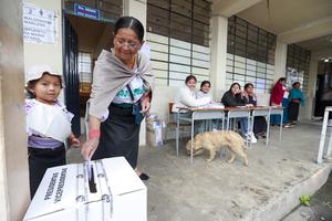 (250413) -- OTAVALO, 13 abril, 2025 (Xinhua) -- Una mujer indígena emite su voto en un colegio electoral en la Unidad Educativa Intercultural Comunitaria Bilingüe Miguel Egas Cabezas, en la ciudad de Otavalo, en la provincia de Imbabura, en el norte de Ecuador, el 13 de abril de 2025. Los colegios electorales en Ecuador abrieron el domingo a las 07:00 hora local (12:00 GMT) para las votaciones de la segunda vuelta de las elecciones presidenciales de 2025. (Xinhua/Ricardo Landeta) (rl) (rtg) (da)