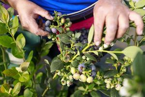 (250507) -- QUITO, 7 mayo, 2025 (Xinhua) -- Una mujer cosecha arándanos en la plantación de la empresa SierraBlue, en la parroquia rural de Tababela, en el norte de Quito, Ecuador, el 7 de mayo de 2025. (Xinhua/Ricardo Landeta) (rl) (ah) (ra) (vf)