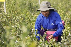 (250507) -- QUITO, 7 mayo, 2025 (Xinhua) -- Una mujer cosecha arándanos en la plantación de la empresa SierraBlue, en la parroquia rural de Tababela, en el norte de Quito, Ecuador, el 7 de mayo de 2025. (Xinhua/Ricardo Landeta) (rl) (ah) (ra) (vf)