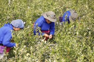 (250507) -- QUITO, 7 mayo, 2025 (Xinhua) -- Mujeres cosechan arándanos en la plantación de la empresa SierraBlue, en la parroquia rural de Tababela, en el norte de Quito, Ecuador, el 7 de mayo de 2025. (Xinhua/Ricardo Landeta) (rl) (ah) (ra) (vf)