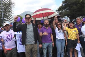 (251101) -- QUITO, 1 noviembre, 2025 (Xinhua) -- Los asambleístas del movimiento oficialista Acción Democrática Nacional, Hernán Zapata (2-i), Andrés Castillo (c), Nataly Morillo (2-d), e Inés Alarcón (d), participan en una marcha durante el inicio de la campaña electoral para la consulta popular y referendo constitucional, en el norte de Quito, capital de Ecuador, el 1 de noviembre de 2025. En Ecuador empezó el sábado oficialmente la campaña electoral para la consulta popular y referendo constitucional del Gobierno, que se realizarán el próximo 16 de noviembre en el país sudamericano, informó el Consejo Nacional Electoral. (Xinhua/Str) (rl) (oa) (da)
