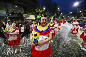 (250304) -- QUITO, 4 marzo, 2025 (Xinhua) -- Imagen del 3 de marzo de 2025 de grupos folclóricos participando en el desfile de luces y colores como parte del festival de Carnaval, en la ciudad de Quito, capital de Ecuador. Ecuador vive con intensidad las fiestas de Carnaval a través de múltiples eventos culturales, coloridos festivales, juegos tradicionales y conciertos, en el marco de un feriado de cuatro días que inició el 1 de marzo. (Xinhua/Ricardo Landeta) (rl) (jg) (ra) (ce)